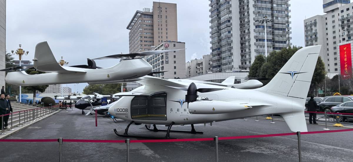 2月24日,春节后的首个工作日。武汉洪山礼堂门前,一架体型巨大的白色eVTOL(电动垂直起降飞行器)格外引人注意。在现场,武汉迅起科技有限公司(以下简称武汉迅起科技)项目总师许志林介绍,现场展出的这款eVTOL,是公司研发生产的V1000货运款,也是国内首款获得民航局TC(型号合格证)受理的大型混动eVTOL。